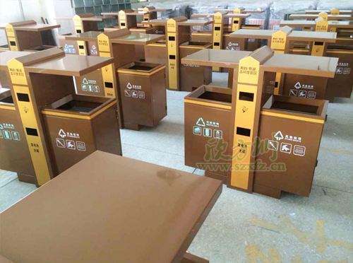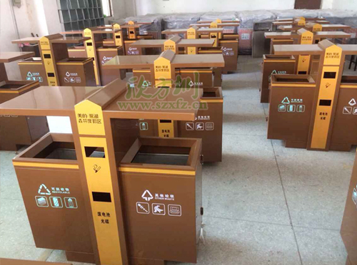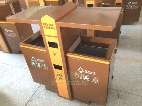 土豪金垃圾桶獨特設計風格F238戶外分類垃圾桶,外桶為足1.2mm鍍鋅板,表面噴塑工藝,內膽為201#,厚足0.75mm, 螺絲螺母為304不銹鋼材質,采用不銹鋼膨脹螺 安裝。噴塑顏色為土豪金色,垃圾桶開口位置坐折邊處理,箱體帶簡易防盜鎖。左右兩邊分別絲印,可回收物,其他垃圾等圖案標志。中間橙黃色區域,印有美的·鷺湖森林度假區,廢電池光碟字樣,字體顏色為土豪金色。欣方圳工程師采用金色的獨特性的設計風格,特別受到物業,房地產,機場,小區等單位的青睞。