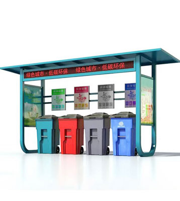 設(shè)有擋雨棚,可配備垃圾箱信息顯示屏、防水照明燈、廣告屏,進(jìn)行地面硬化。對社區(qū)玻金塑紙可回收物,其他垃圾,廚余垃圾,有害垃圾等生活垃圾定時定點(diǎn)投放收集.