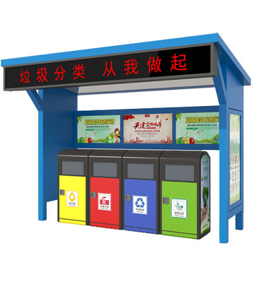 設有擋雨棚,可配備垃圾箱信息顯示屏、防水照明燈、廣告屏,進行地面硬化。對社區玻金塑紙可回收物,其他垃圾,廚余垃圾,有害垃圾等生活垃圾定時定點投放收集.