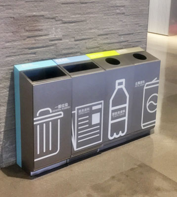 欣方圳商場不銹鋼室內(nèi)滑軌四分類果皮箱批量生產(chǎn)圖
